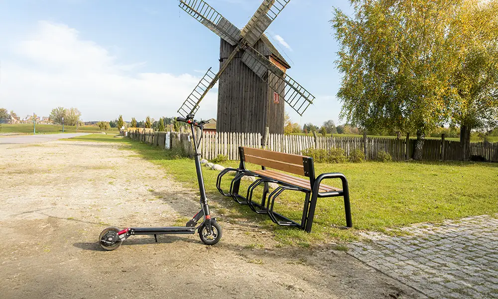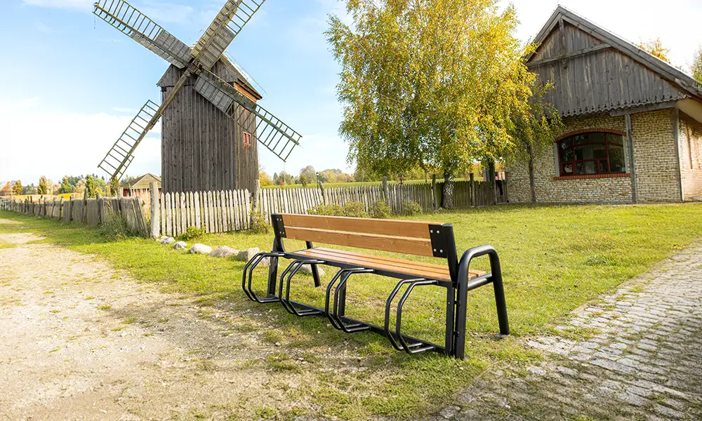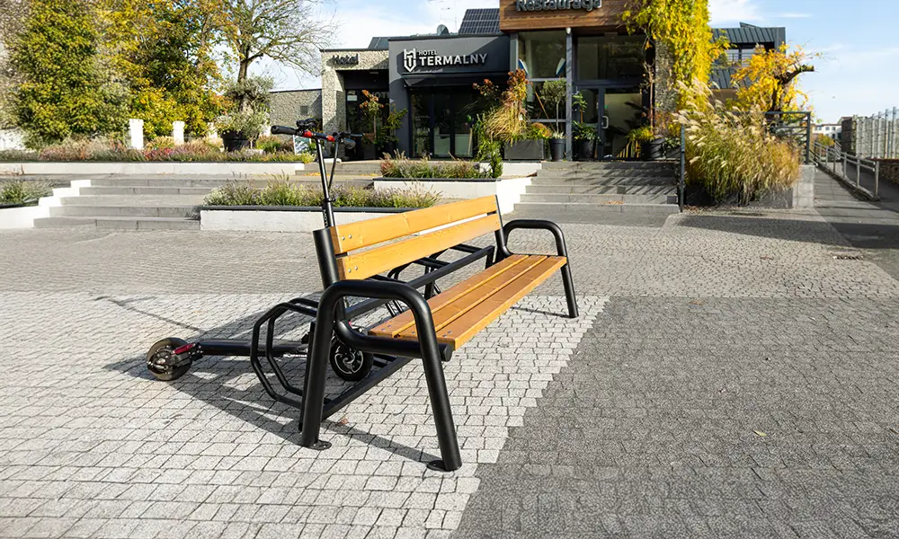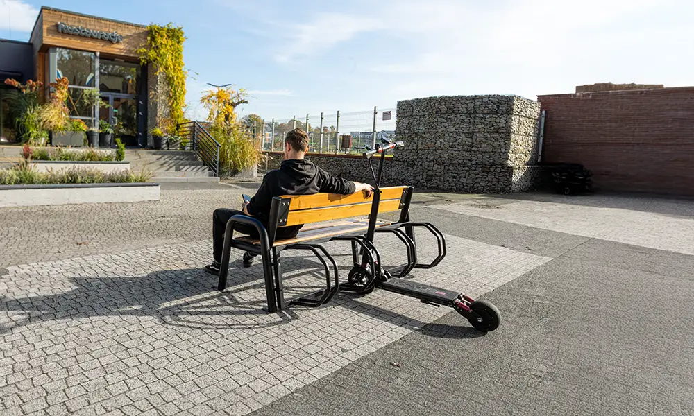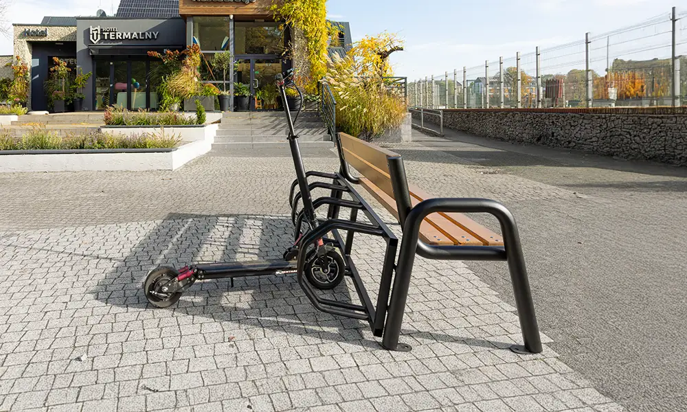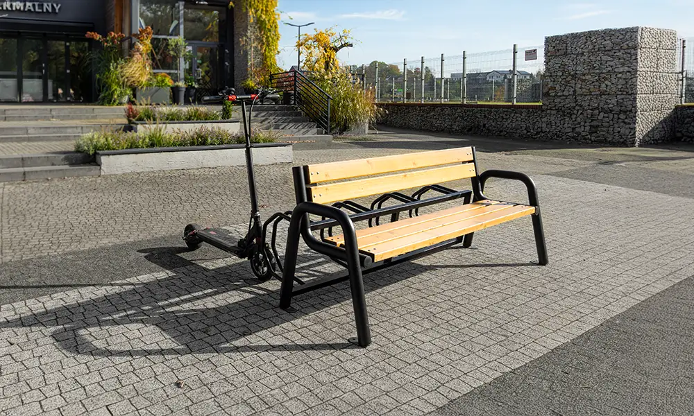 Konstrukcija klupe temelji se na čvrstom čeličnom okviru, otpornom na intenzivnu upotrebu i promjenjive vremenske uvjete. Sjedište, izrađeno od izdržljivih materijala, osigurava udobnost i dugotrajno zadržava svoj estetski izgled. Integrirani stalak omogućuje sigurno parkiranje bicikala, a njegov dizajn omogućuje i praktično postavljanje skutera, što klupu čini svestranim elementom mobilne infrastrukture.