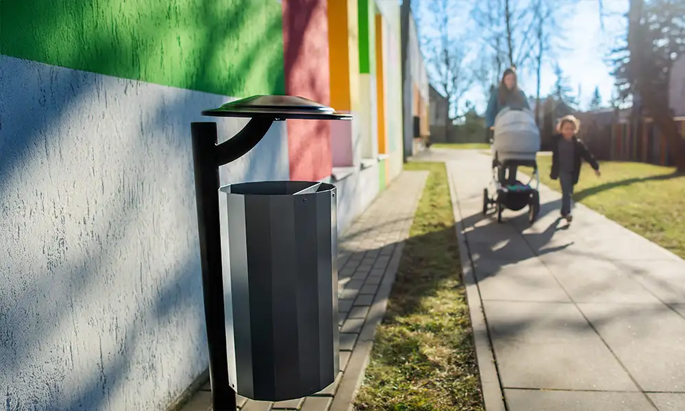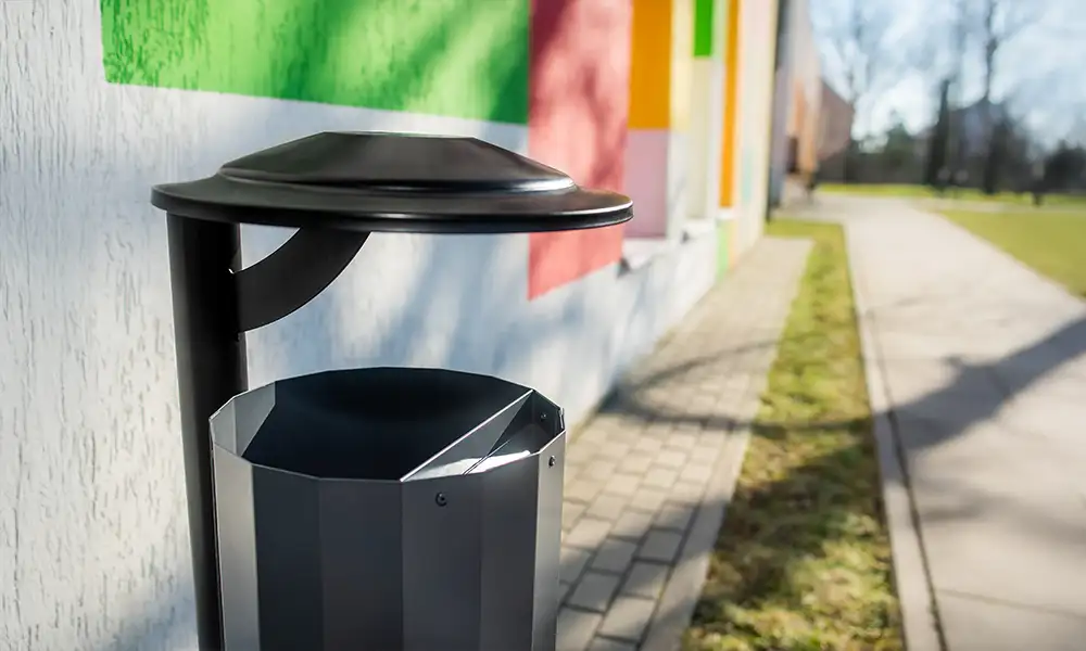 Konstrukcija kante poduprta je čvrstim čeličnim stupom, što osigurava stabilnost i otpornost na svakodnevnu upotrebu u javnim prostorima. I okvir i spremnik su praškasto obojeni, što štiti površinu od korozije, vlage i promjenjivih vremenskih uvjeta.